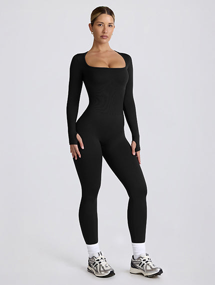 Seamless Micro Rib Scoop-Neck Unitard in Black